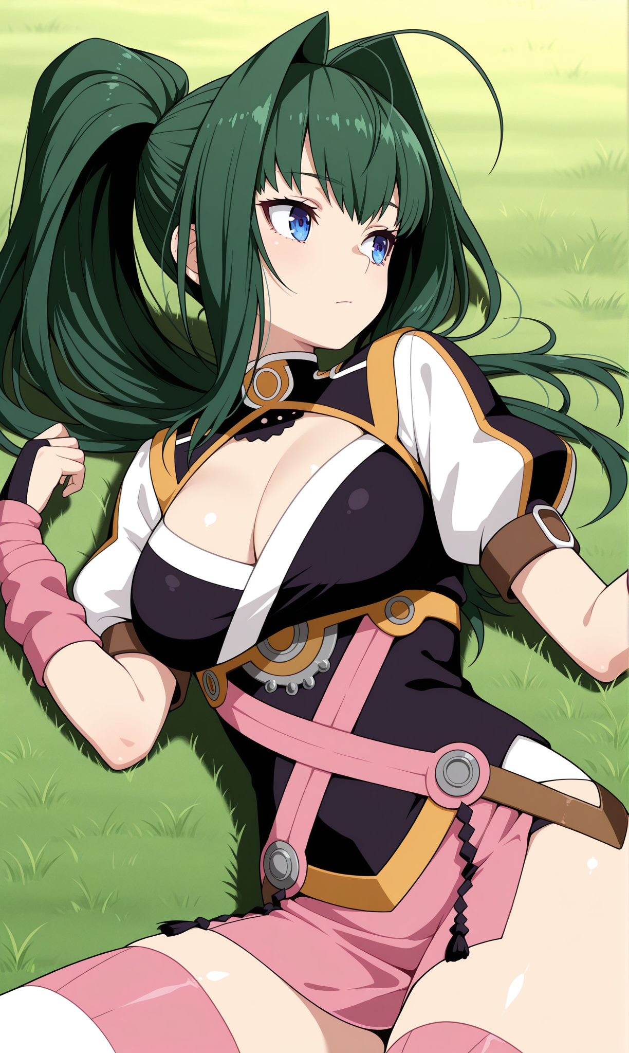 Image description: A young woman with blue eyes, long dark green hair styled in a high ponytail, and a contemplative expression lying on her back in the grass, looking off to the right. She is wearing a fantasy-style outfit consisting of a black and white top with a chest cutout, a pink skirt, a harness of pink straps, and pink forearm wraps. The background is a uniform field of green grass.